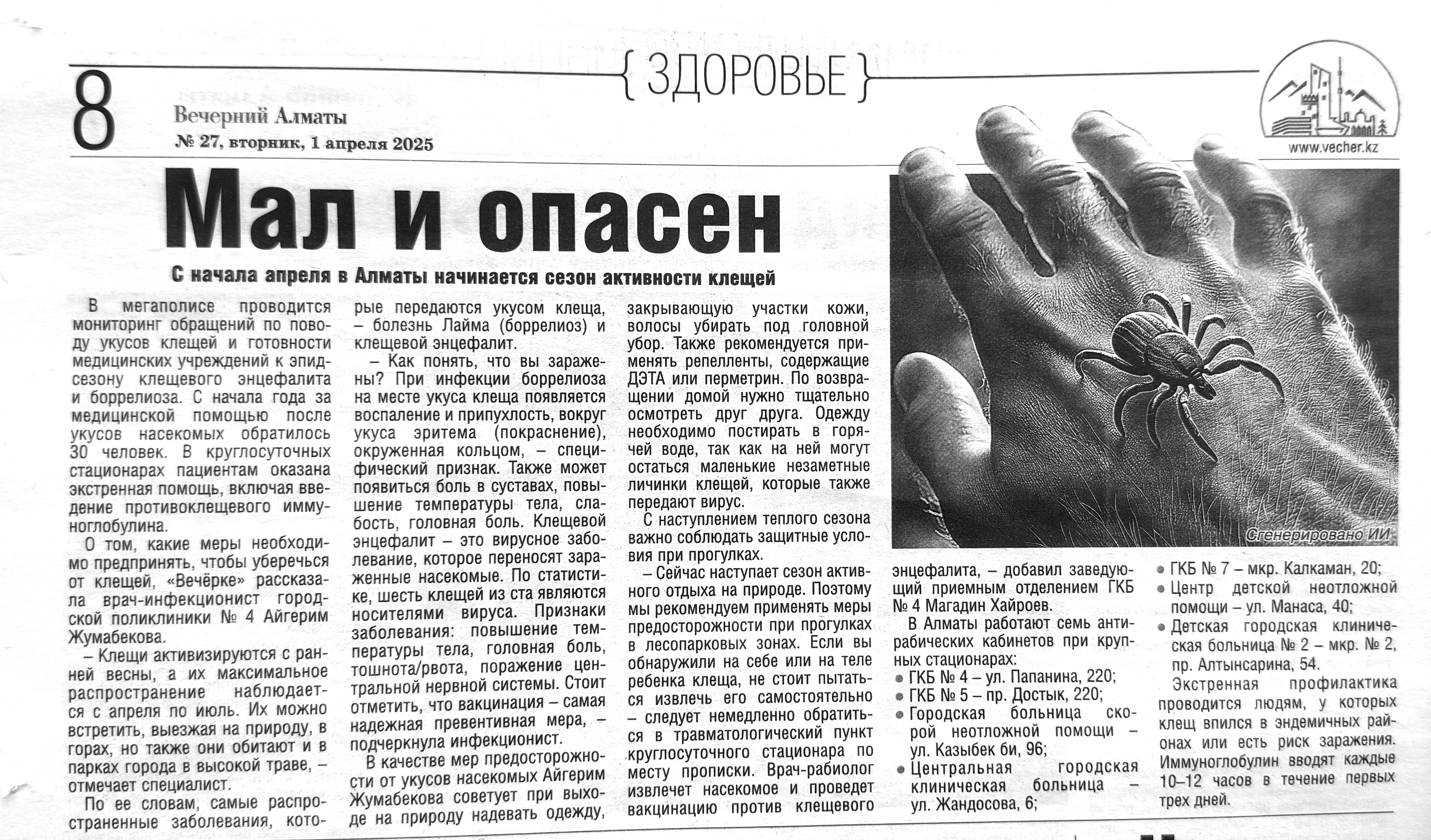 Интервью врача-инфекциониста ГП №4 г.Алматы Айгерим Жумабековой г. "Вечерний Алматы", 1 апреля 2025
