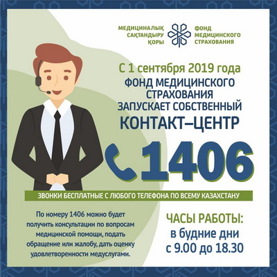 1 қыркүйектен бастап 1406 нөмірі бойынша медициналық көмек мәселелері бойынша кеңес алуға, өтініш немесе шағым беруге, медициналық қызметтерге баға беруге болады.