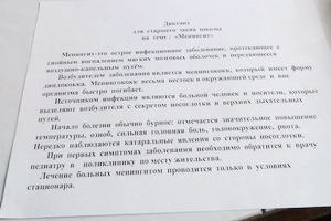 №4 Қалалық емхананың мейірбикелері Л.В.Иванова., А.А.Базилевич №60 мектеп-гимназияның 5-8 сынып оқушыларымен «Менингит профилактикасы» тақырыбында дәріс өткізді. Оқушылар менингит деген не, оның алдын алу шаралары туралы білетін болды. Дәріс соңында ос тақырыпта диктант жазды.