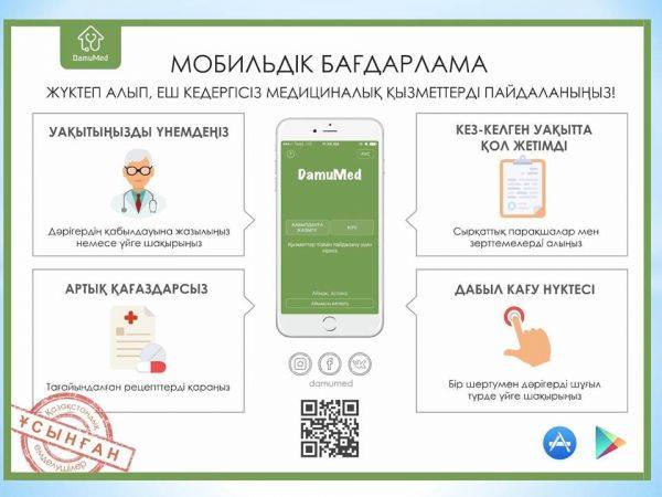 Денсаулық сақтау жүйесін цифровизациялау бойынша Жол картасын жүзеге асыру аясында 2018 жылдың мамыр айынан бастап біздің емхана электронды жүйеге ауысады. Тіркелген әрбір тұрғынның электронды денсаулық пспорты болады. Сонымен қатар DamuMed мобильді қосымшасы бар екенін естеріңізге саламыз. Мобильді қосымшада «Дәрігер қабылдауына жазылу», «Дәрігерді үйге шақырту» сияқты қызмет түрлері бар, әрі Сіз қосымша арқылы зертханалық тексерулер, еңбекке жарамсыздық парағы, рецептер туралы ақпараттарды біле аласыз. Бұл өте ыңғайлы, жылдам.