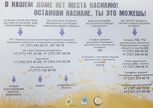 Было подробно рассказано о цели и задачах Кризисного центра, оказывающего социально-бытовые, социально-медицинские, социально-психологические, социально-педагогические, социально-трудовые, социально-культурные, социально-экономические и социально-правовые услуги. В случае, если женщины хотят передать сигнал о факте насилия, попали в трудную жизненную ситуацию, стали жертвой бытового насилия, нуждаются в экстренной помощи психолога, то необходимо обратиться в КГУ «Кризисный центр для жертв бытового насилия» Управления занятости и социальных программ г. Алматы по тел.: +7(727) 243 22 21, 267 40 78.