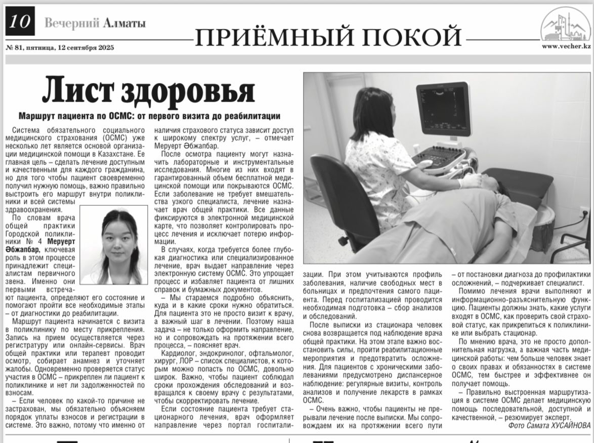 Интервью врача общей практики Городской поликлиники 4 г. Алматы Меруерт Әбжапбар, газета «Вечерний Алматы», 12 сентября 2025 г.